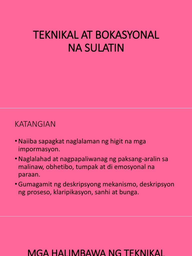 Ang teknikal na sulatin Ay uri ng sulating sa teknikal na komunikasyong ginagamit sa ibat-ibang larangan ng okupasyon. Ito rin ay gumagamit ng deskripsyon ng mekanismo deskripsyon ng proseso klaripikasyon sanhi at bunga paghahambing at pagkakaiba analohiya at. Isa sa mga kagandahan ng pagsusulat ng teknikal-bokasyunal na lathalain ay ang pagkakaroon nito ng isang matagalang pagsasaliksik.
