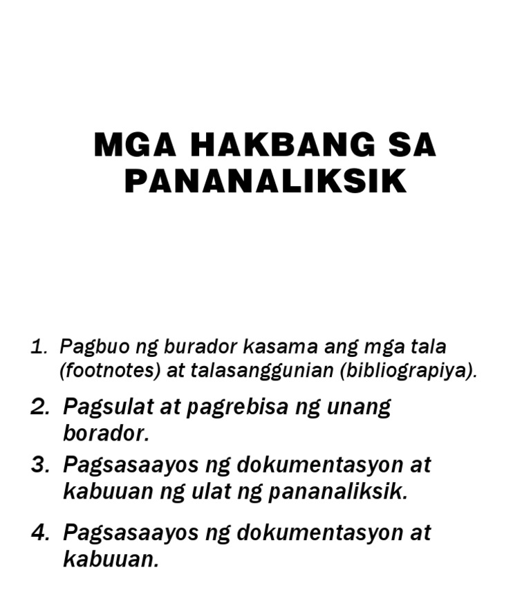 Hakbang sa pananaliksik na nagbibigay direksyon at gabay sa pananaliksik. - nararapat pinag-isipang mabuti at dumaan sa isang maingat na pagsusuri upang matiyak na makabubuo ng. Maaari ring kumuha ng mga detalye o impormasyon sa mga aklat.