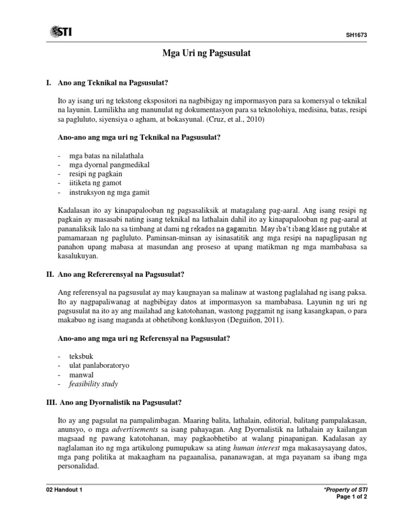 Ano ang pagsulat-Ang pagsulat ay pagsasalin sa papel o sa anumang kasangkapang maaaring magamit na mapagsasalinan ng mga nabuong salita simbolo at ilustrasyon ng isang tao o mga tao sa layuning maipahayag ang nasa kanyang kaisipan Sauco et al. Teknikal na pagsulat isang uri ng tekstong ekspositori na nagbibigay ng impormasyon para sa komersyal o teknikal na layuninLimilikha ang manunulat ng dokumentasyon para sa teknolohiya. Ang diin ay mahalaga para malaman mo ang emosyon na ipinapahiwatig sa sulat.