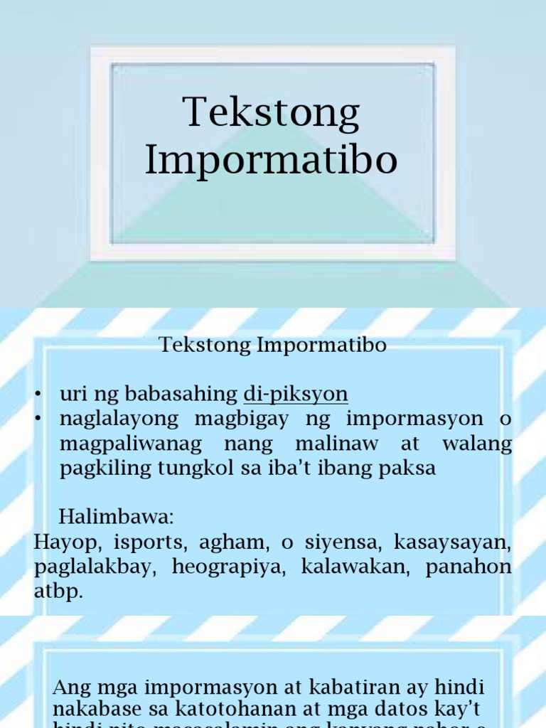 Ito ay nagbibigay ng mga impormasyong nakapagpapalawak ng kaalaman ay nagbibigay liwanag sa mga paksang inilalahad upang mapawi nang lubos ang pag-aalinlangan. Ang Tekstong Impormatibo. Ang tekstong impormatibo ay kilala sa alternatibong pangalang ekspositori nilalayon ng tekstong makapagbigay ng detalyado makatotohanan at tiyak na impormasyon patungkol sa isang bagay tao hayop lugar o pangyayari.