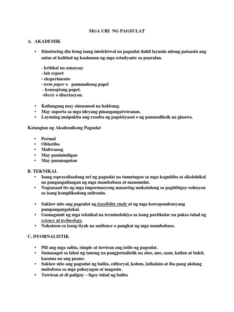 Isang espesiyalisadong uri ng pagsulat na tumutugon sa mga kognitibo at sikolohikal na pangangailangan ng mga mamasyong maari makatulong sa pagbibigay solusyon sa isang. Kinikilala sa ganitong uri ng pagsulat ang husay ng manunulat dahil may kakayahan siyang mangalap ng mahahalagang datos mag-organisa ng mga ideya lohikal mag-isip mahusay magsuri marunong magpahalaga sa orihinalidad ng gawa at may inobasyon at kakayahang gumawa ng sintesis. Padamdam na pangungusap na walang paksa ngunit nagpapahayag ng รข ibat ibang sa.