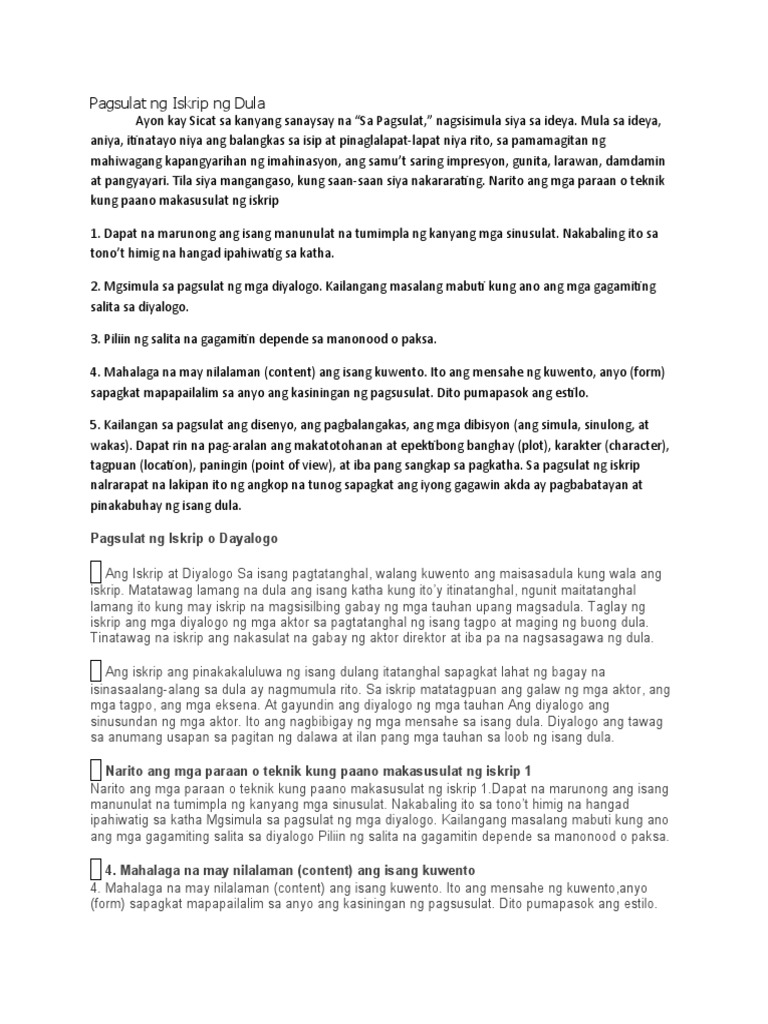 Mga paraan sa pagsulat ng dula. Gabay sa Pagsulat ng Dula. Rubrics para sa Pagsulat ng Iskrip sa Dula-dulaan Criteria Katangi-tangi 20 Kapuri-puri 15 Katangap-tangap 10 Kailangan pang pagbutihan 5 Mga Nilalaman Naisusulat at naiisa-isa ang kaalaman sa pagsulat ng iskrip sa dula-dulaan Nailalahad ngunit hindi naiisa-isa ang kaalaman sa pagsulat ng iskrip sa dula-dulaan Kulang ang ideya sa pagsulat ng. Maaari ring gamitin ang personipikasyon sa mga tula.