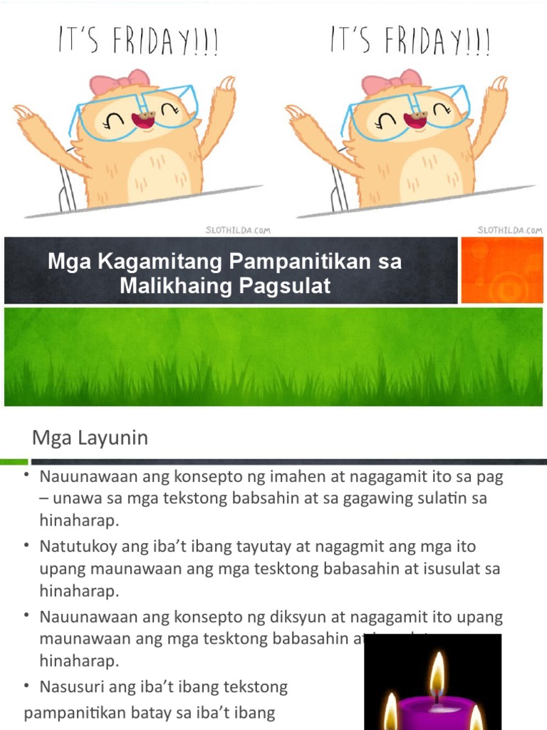 -pinag aaralan nang husto ng mga estudyante sa bawat kurso ang ganitong pagsulat bago sila makapagtrabaho-sa mga guro lesson plans instructional materials-sa mga doktor pagsulat ng reseta patients journal o medical report-abogado briefs at pleadings legal forms-pulis investigative report at. Malikhaing Pagsulat Mga Layunin Nauunawaan ang konsepto ng imahen at nagagamit ito sa pag unawa sa mga tekstong babsahin at sa gagawing sulatin sa hinaharap. Actual Writing hakbang na kinapapalooban ng pagsulat ng buradordraft 3.