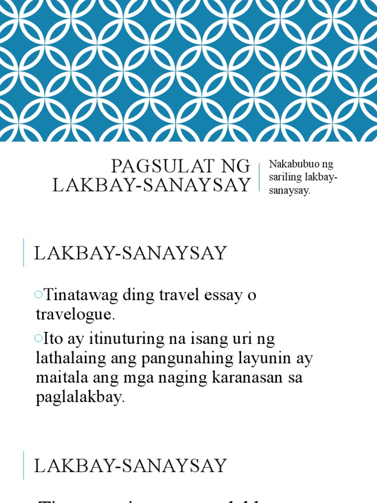 Mahalagang magtaglay ito ng patunay o patotoo 4. Maging masuri at obhetibo sa mga. Higit sa lahat ito ay tungkol din sa sarili sapagkat ang karanasan ng tao ang nagbibigay-kulay sa pagsulat ng lakbay-sanaysay.