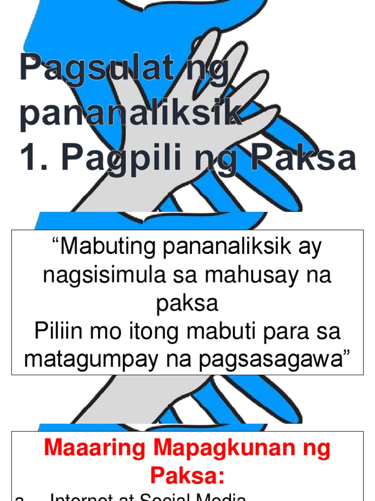 Pagbasa at Pagsulat Tungo sa Pananaliksik Bakgrawnd sa Kurso Ang kursong ito ay naglalayong mapalawak ang kaalaman at kasanayan ng mga mag- aaral sa kritikal na pagbasa at lohikal n pagsulat tungo sa pagsasagawa ng sariling pananaliksik. You can manage even a messy process if you know that behind it is a series of tasks whose order makes. Pumili at Maglimita ng PaksaPangalawa.