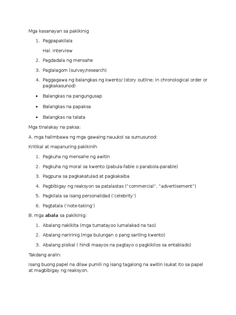 Kasanayan sa pagsulat ng mga mag-aaral sa Grade 11 ng Sogod National High School na ginamitan ng eklektik at tradisyunal na dulog ayon sa nilalaman organisasyon bokabularyo gamit at mekaniks. Makrong Kasanayan sa Pakikinig KAHULUGAN NG PAKIKINIG Ito ay isang aktibong proseso ng pagtanggap ng mensahe sa pamamagitan ng sensoring pandinig at pag-iisip. Aktibo ito dahil nagbibigay-daan ito sa isang tao na pag-isipan tandaan at ianalisa ang kahulugan at kabuluhan ng mga salitang kanyang.