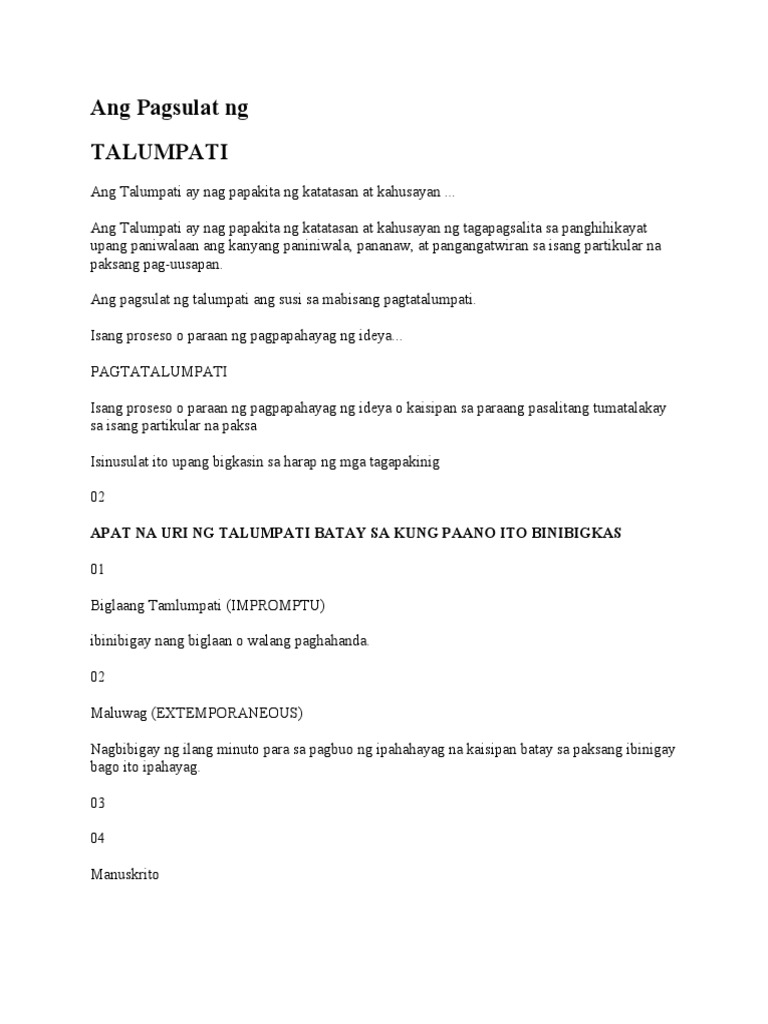 May pagkakataon na hindi tiyak sa kanyang talumpati pero tuloy para. TALUMPATI Sa paksang ito ating tatalakayin kung paano nga ba gumawa ng isang talumpati at ang mga hakbang nito. Paraan ng Pagtatalumpati Day 4 Binasa- Inihanda at inihanda at iniayos ang pagsulat upang basahin ng malakas sa harap ng mga tagapakinig.