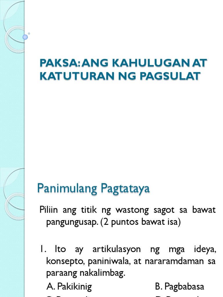 KATUTURAN NG PAGSULAT Panimulang Pagtataya Piliin ang titik ng wastong sagot sa bawat pangungusap. NILALAMAN NG KURSO Nauunawaan ang kalikasan layunin at paraan ng pagsulat ng ibat ibang anyo ng sulating ginagamit sa pag- aaral sa.
