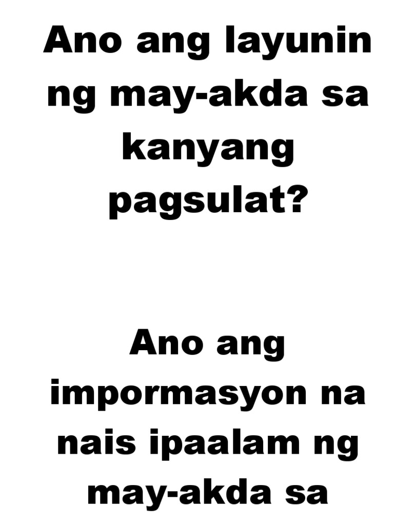 Tanong pagkatapos marinig ang teksto 1. Maaring layunin niyang mapalawak pa ang kaalaman ukol sa sa isang paksa. Mga Layunin ng Pagsulat.