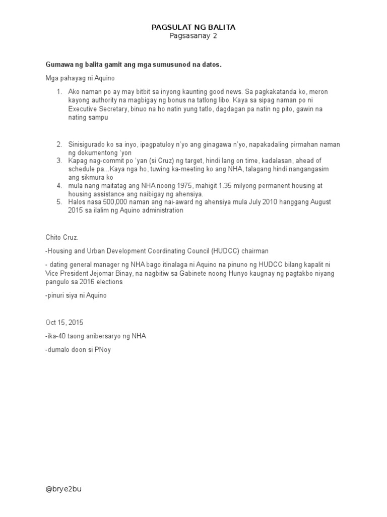 Factsheet sa pagsulat ng balita. Sa pagkakatanda ko meron kayong authority na magbigay ng bonus na tatlong libo. Mga pahayag ni Aquino 1. Mga Sagot sa Pagsasanay sa Balitang Isports.