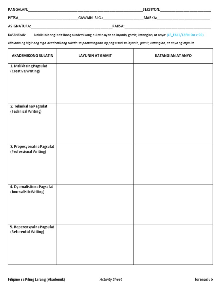 Ipinapahayag ang damdamin ideya at mensahe ng manunulat. Ang pagsulat ay parehong gawaing kognitibo at saykomotor ngunit pangunahing nililinang ay ang gawaing kognitibo. Sundin ang tsart Adyenda Kahulugan Layunin Katangian Gamit Anyoporma Karagdagang Gawain Panuto.
