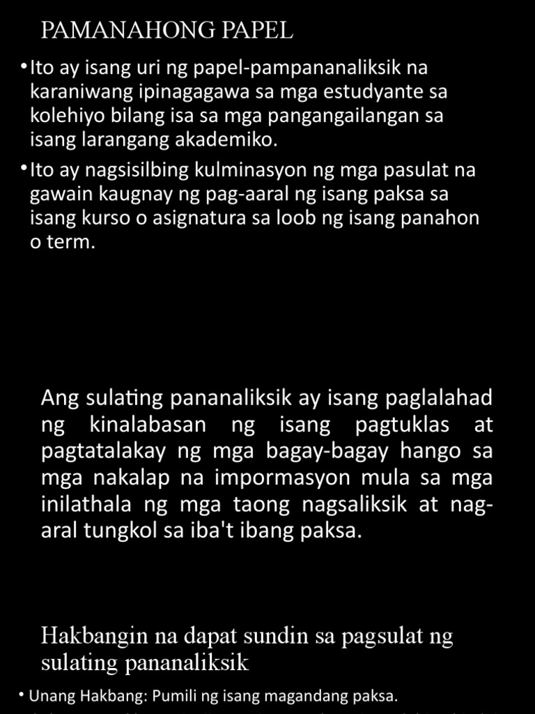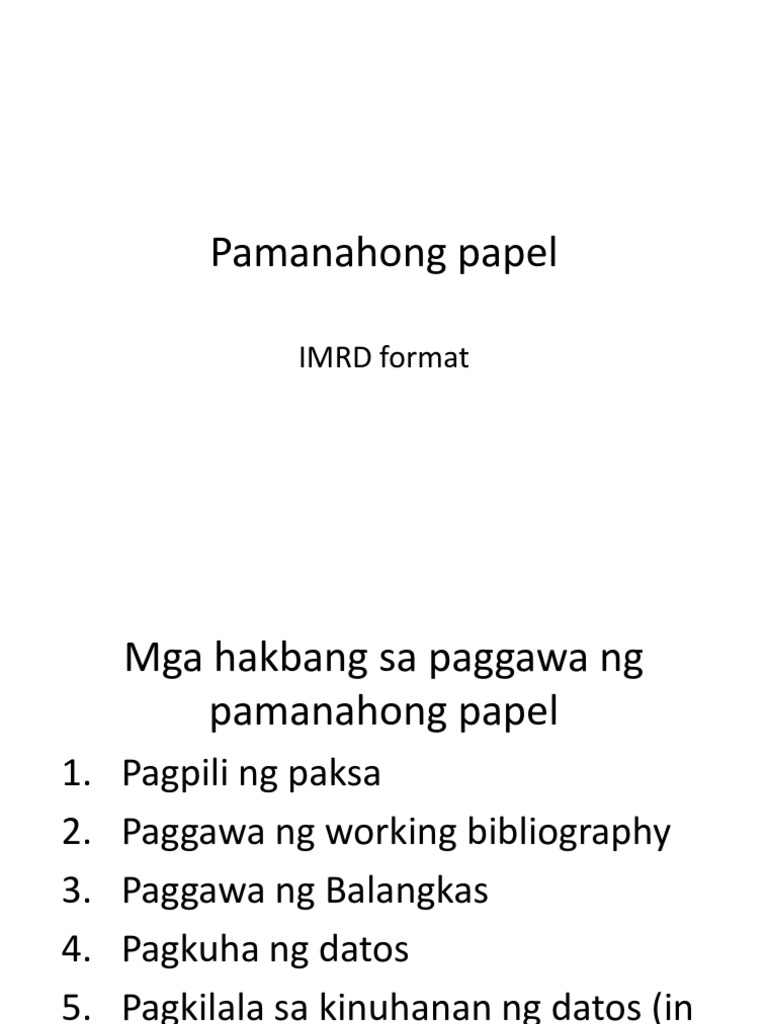 Mga hakbang sa pagsulat ng pamanahong papel. Ang Listahan ng Sanggunian ay isang kumpletong tala ng lahat ng mga hanguan o sorses na ginamit ng mananaliksik sa pagsulat ng pamanahong papel. Mga hakbang sa Pagsulat ng Pamanahong Papel Antas ng Kahirapan Interes Hakbang 7 Pagsulat ng Unang Burador Hakbang 8 Ang Pag-eedit at Pgrerebisa ng Pananaliksik ng Papel Hakbang 3 Malawakang Pagbabasa Kaugnay ng Napiling Pag-aaral Hakbang 9 Paglalathala Hakbang 2 Pagtatakda ng. Pamanahong Papel o Pananaliksik Research Paper 1.
